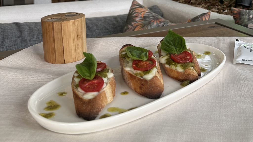 Fransız Baget Ekmeği, Mozarella Peynir, Pesto Sos, Çeri Domates ile servis edilir.
