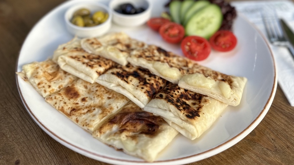 Beyaz Peynir, Domates, Kekik, Söğüş ve Zeytin ile Servis Edilir.