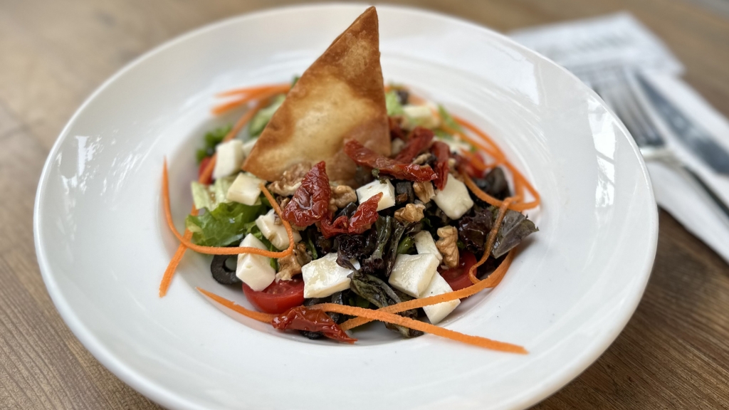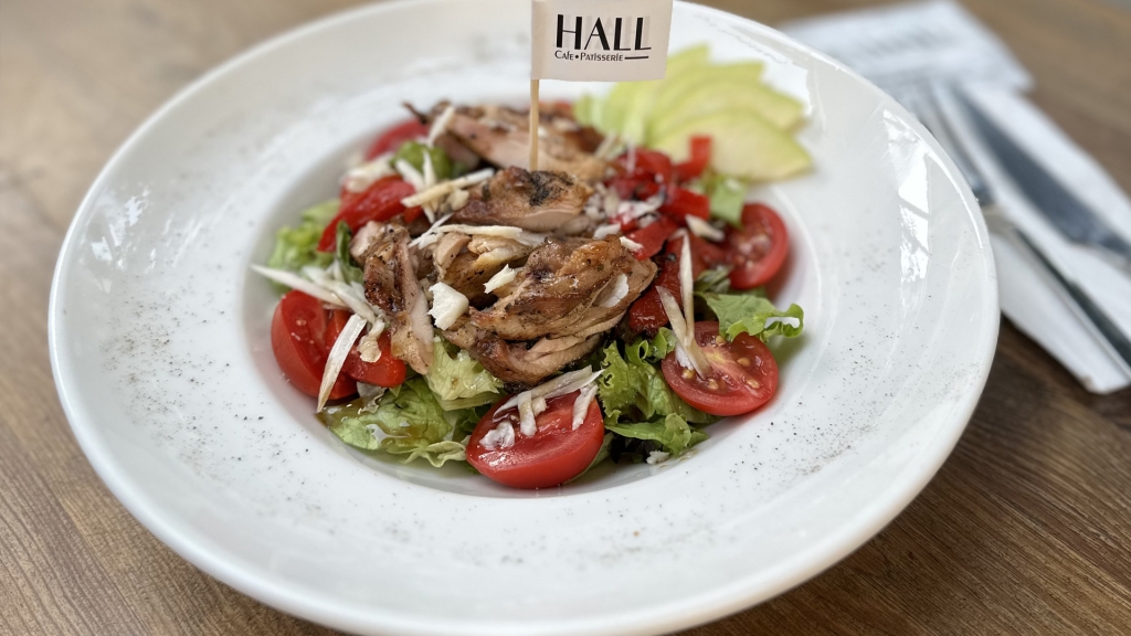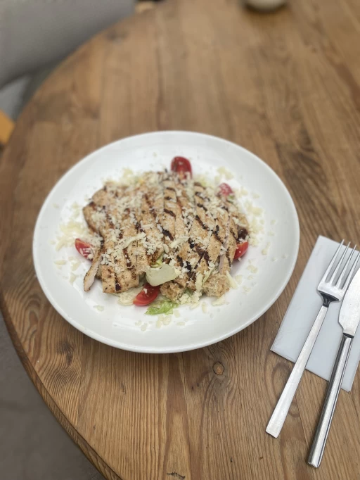 Akdeniz Yeşillikleri, Kırmızı Köz Biber, Çeri Domates, Izgara Tavuk, Parmesan Peyniri, Yeşil Elma ve Nar Ekşisi ile Servis Edilir.