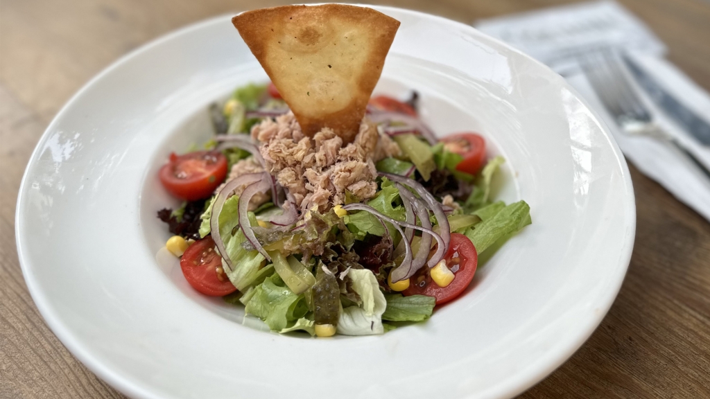 Akdeniz Yeşillikleri, Turşu, Çeri Domates, Slize Soğan, Mısır ve Ton Balığı ile Servis Edilir.