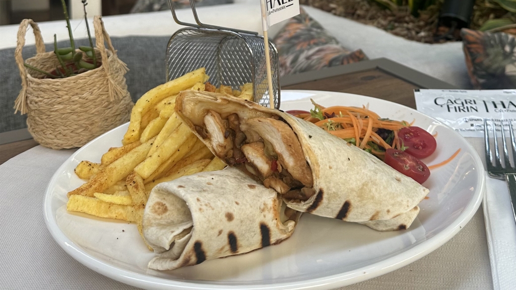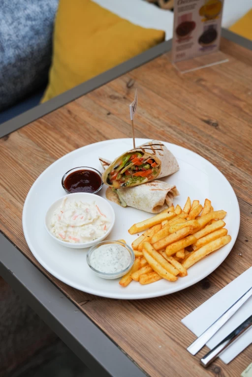 Özel tortilla ekmeğinde, ızgara kabak, havuç, çarliston biber, kapya biber, mantar, patates kızartması, coleslaw ve dip soslarla beraber servis edilir.