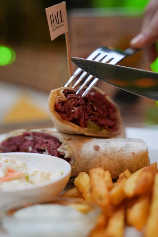 Özel tortilla ekmeğinde, sosis, salam, sucuk, turşu, ketçap, mayonez, patates kızartması, coleslaw ve dip soslarla servis edilir.